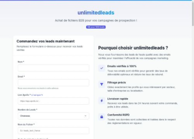 'UnlimitedLeads, un service d'**achat de fichiers B2B** pour les campagnes de prospection commerciale. Le site propose des bases de données de contacts professionnels à des tarifs abordables, avec un prix de base de 10€ pour 1000 leads.