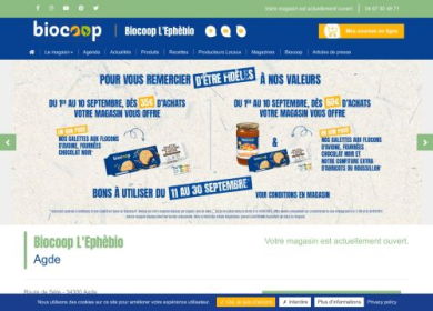 Dédiée à la consommation bio responsable, La Biocoop l'Ephèbio d'Agde est un nouveau magasin bio de 230 m² où vous pouvez retrouver plus de 4500 référ...