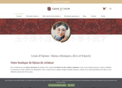 Grain d'Opium est un site de vente en ligne de bijoux et de décoration d'intérieur artisanaux crées par une autoentrepreneuse lyonnaise. Elle propose...
