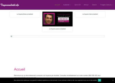 Bienvenue sur ce site entièrement refait en 2018. Il présente des services de voyance par audiotel, qui est un système de numéro surtaxé permettant de...